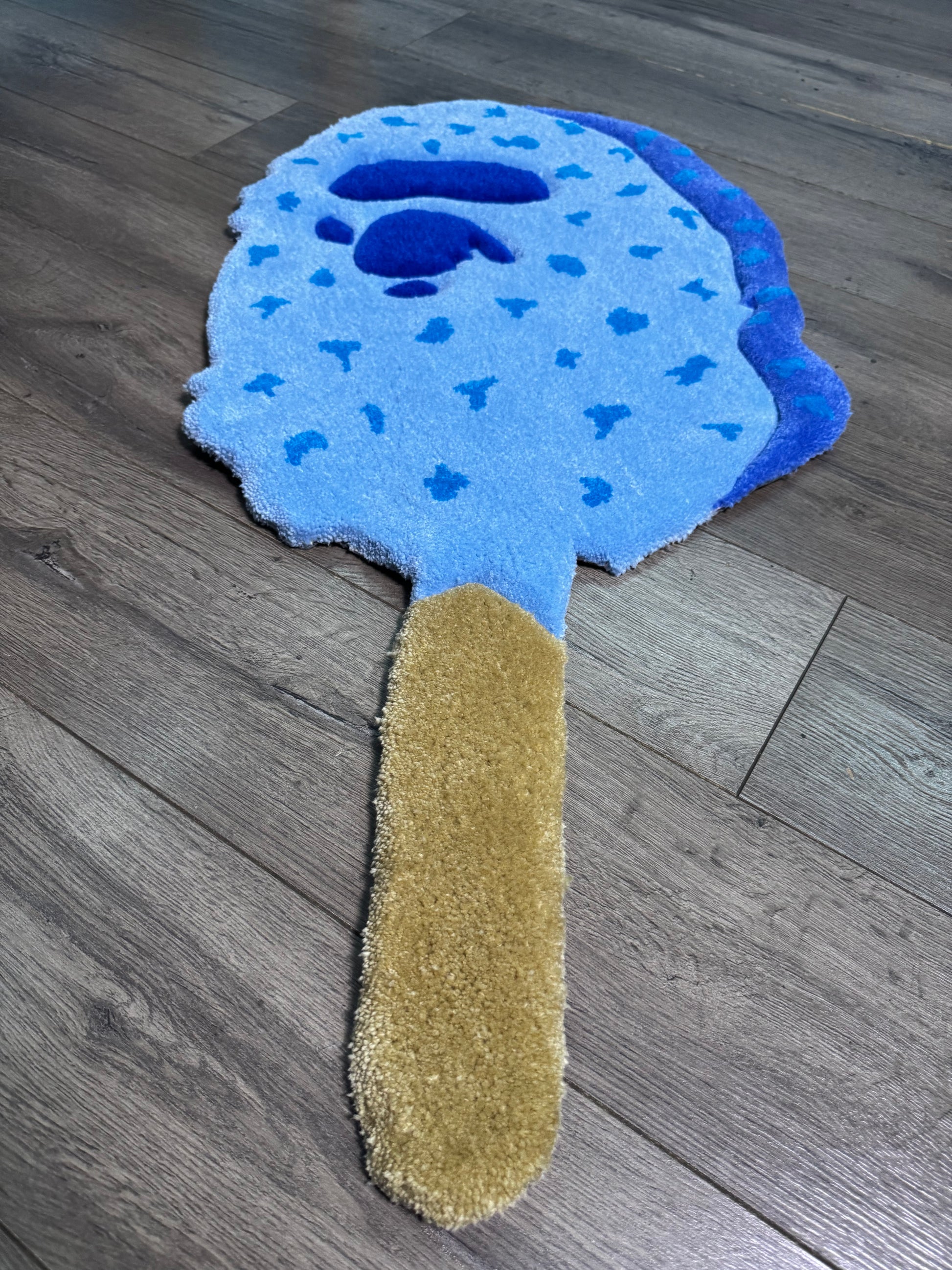 Introducing our 100% handmade Bape Blueberry Ice Cream Rug! Made with 100% acrylic yarn, this rug measures L 3ft 1in W 1ft 5in, bringing a pop of color and fun to any room. Add character and cozy vibes with this unique piece.